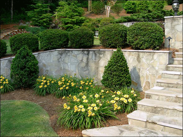 Это простое, натуральное и удобное решение для лестниц входной группы, террасированных переходов и прочих ландшафтных уступов. Для ступеней используется рваный камень более 3 см толщиной. Подбор, подрезка, укладка проводятся по месту монтажа.